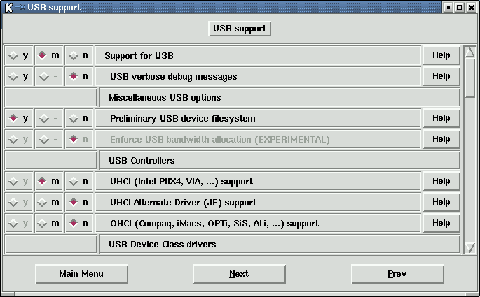 Habilitar simplemente los puertos USB de tu placa base no es suficiente, necesitas especificar también los drivers (módulos) del periférico USB que está conectado a tu ordenador. La lista que aparece bajo ÚSB Device Class drivers' tiene varias opciones. Lo que sigue es bastante sencillo y poco puede fallar: de todas maneras, en caso de duda lee la ayuda.